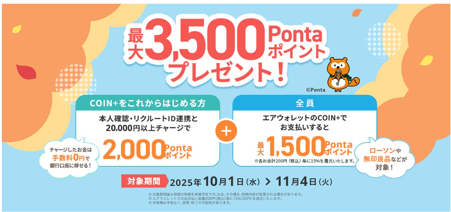 自分は2025年9月からコインプラスを使い始めましたが、最初の本人確認とリクルートIDとの連携、2万円チャージで2,000Ponta ポイントの還元はやっていました。なので頻繁に行われてるキャンペーンと思われます。