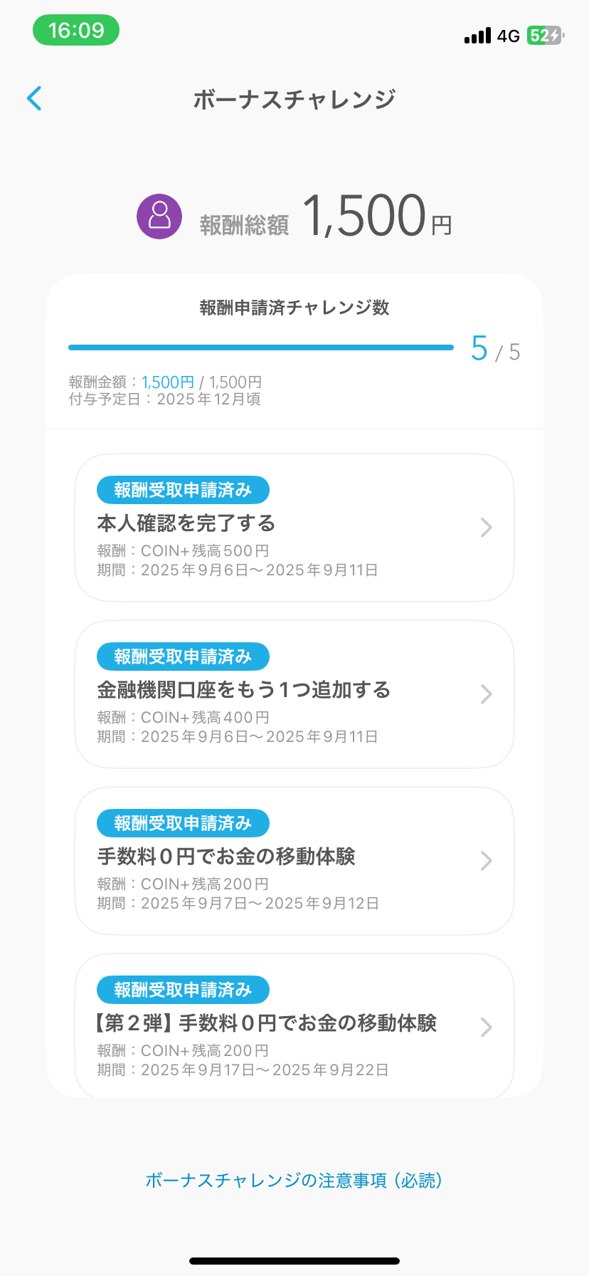 コインプラス利用に必要な作業をやって、銀行口座への送金体験をすることで1,500円が貰えます。作業に1時間もかかりませんので、時給1,500円以上のインパクトがあります。