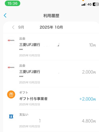 2025年10月22日にローソンで4,800円の決済をしていますが、1.0%とか0.5%の還元はありません。ポイントがつかない現金利用と同じです。銀行口座から直接チャージして支払いますので、実態は現金みたいなものです。